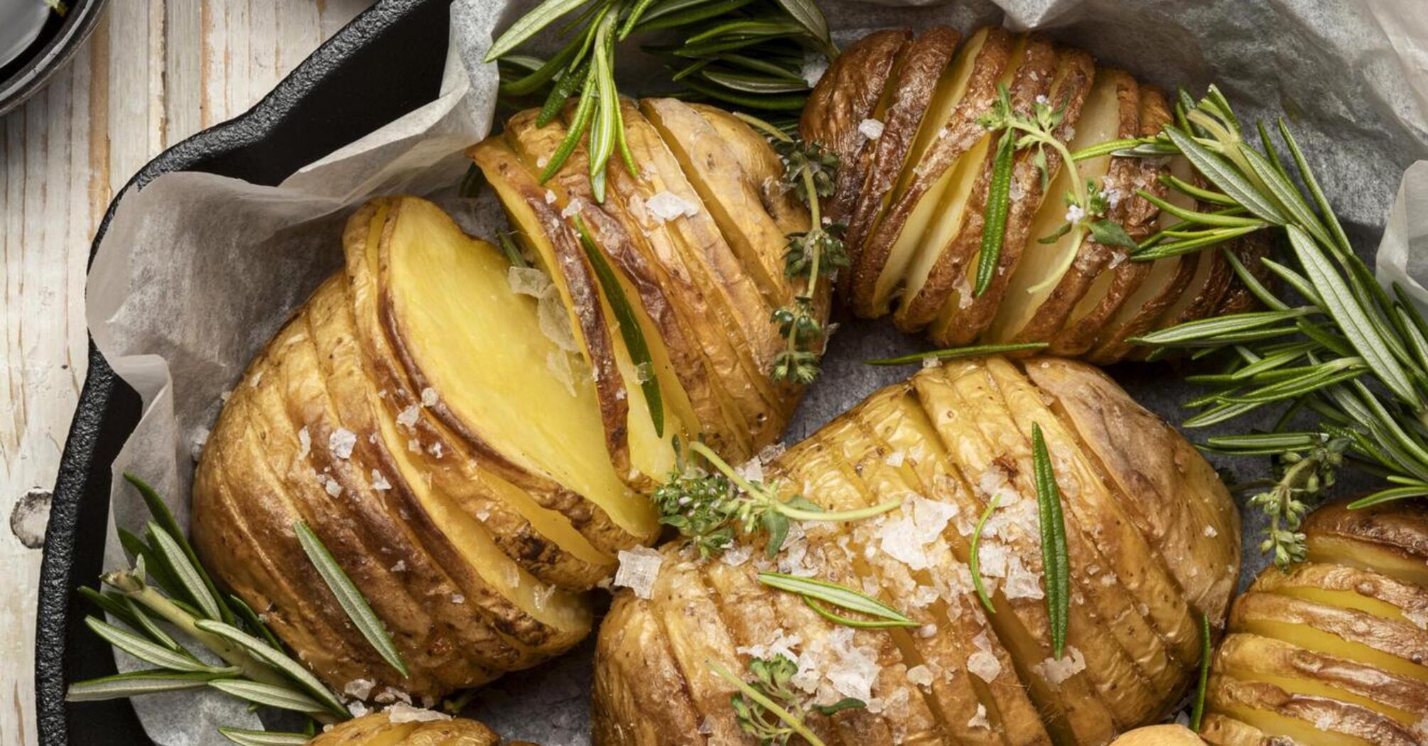 1. Ziemniaki obrać, umyć, osuszyć, odciąć spód, aby były stabilne. Wykonać poprzeczne nacięcia, ale nie do końca.